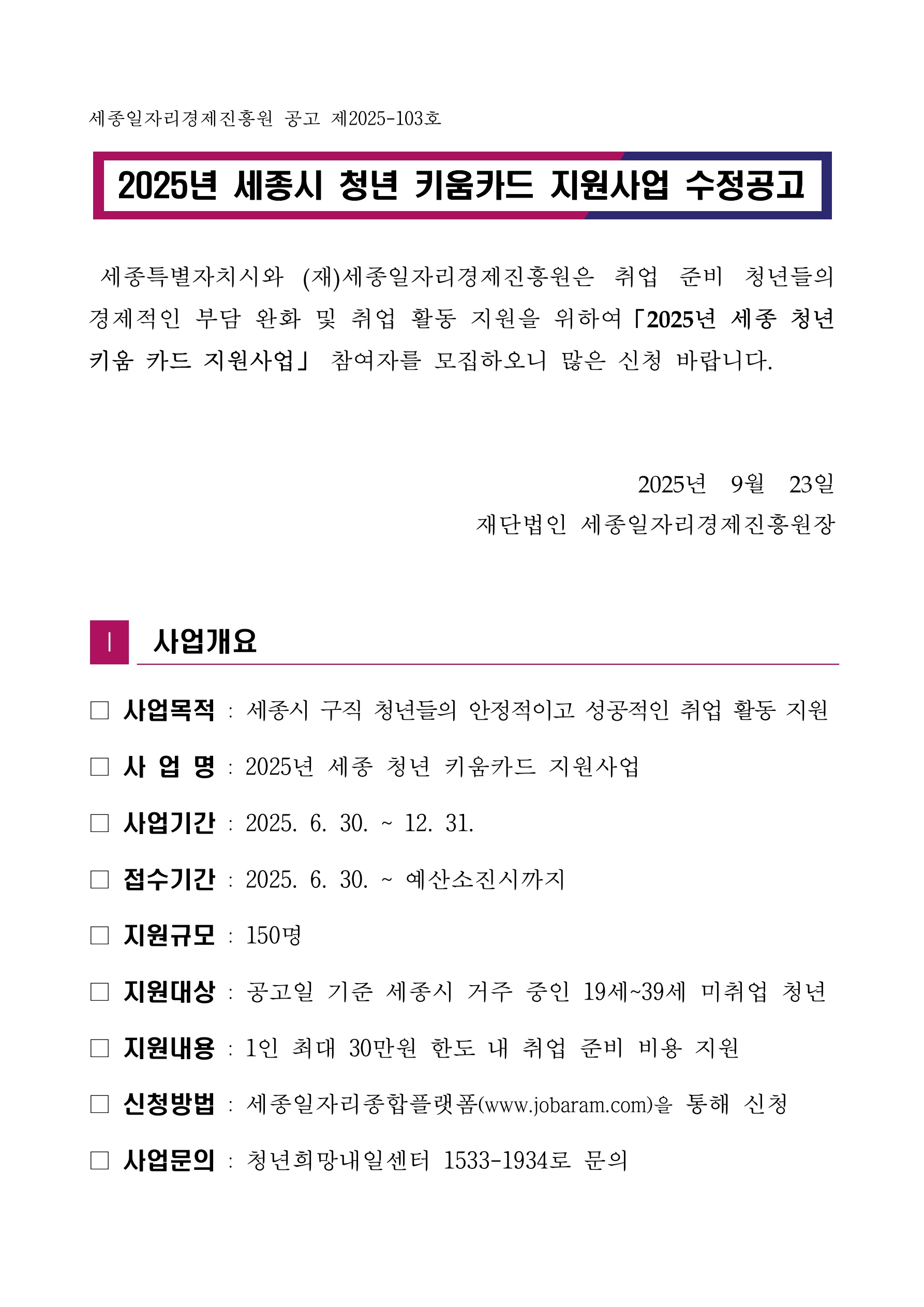 ※ 본 신청 공고는  「 2025년 세종 청년 키움 카드 지원사업 모집 공고」 의 일환으로 진행되며, 키움카드 지원사업 선정자만 신청이 가능합니다.