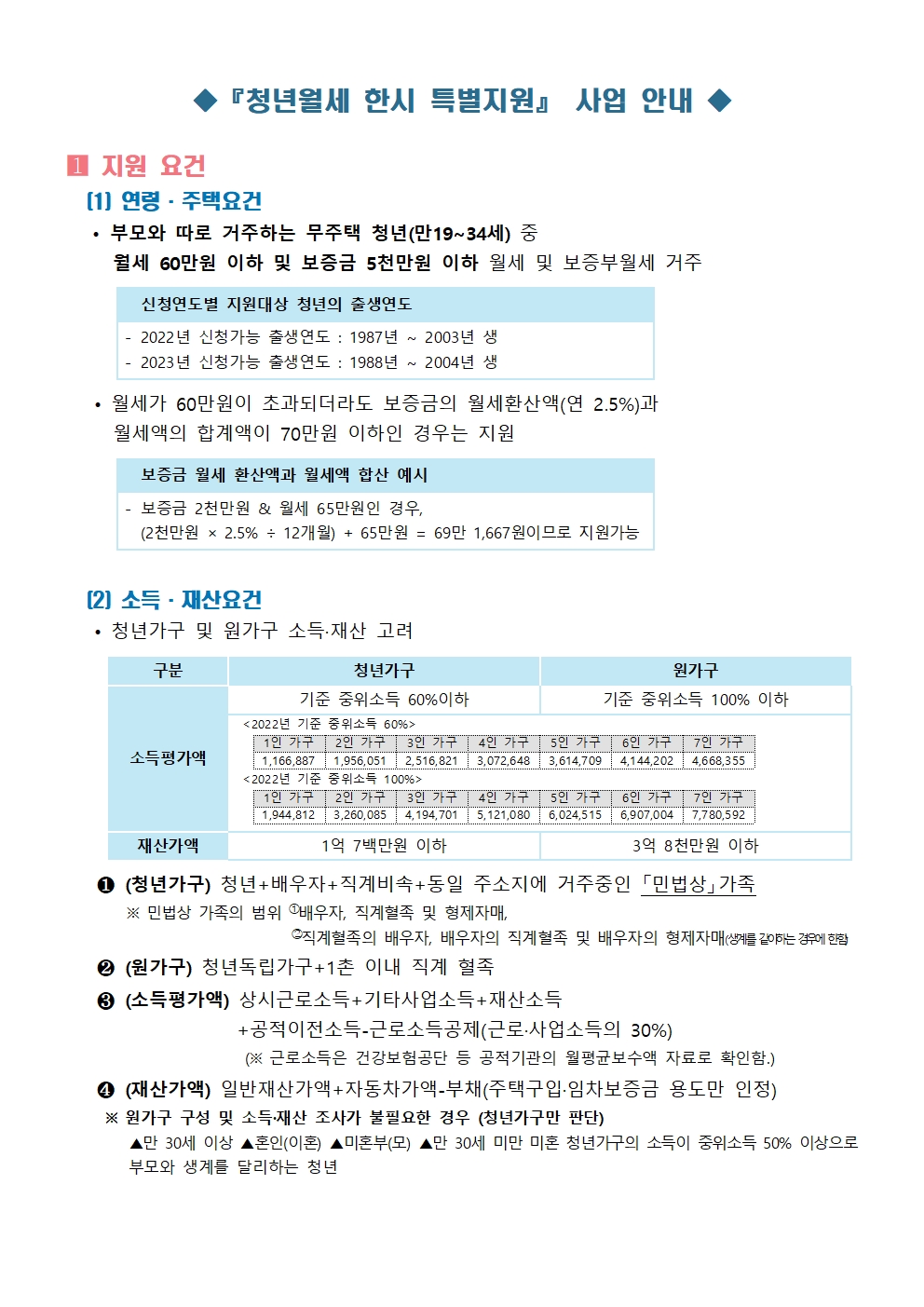 청년월세 한시 특별지원 사업 모집기간 2023.01.01. - 2023.08.21. 모집마감 서비스 구분 정착지원 지원대상 청년 기관명 국토교통부 기관 주소 세종특별자치시 한누리대로 2130 담당자 연락처 1600-0777 담당자 이메일 지원방법 온라인 및 오프라인 신청 지원신청 이동하기 목록