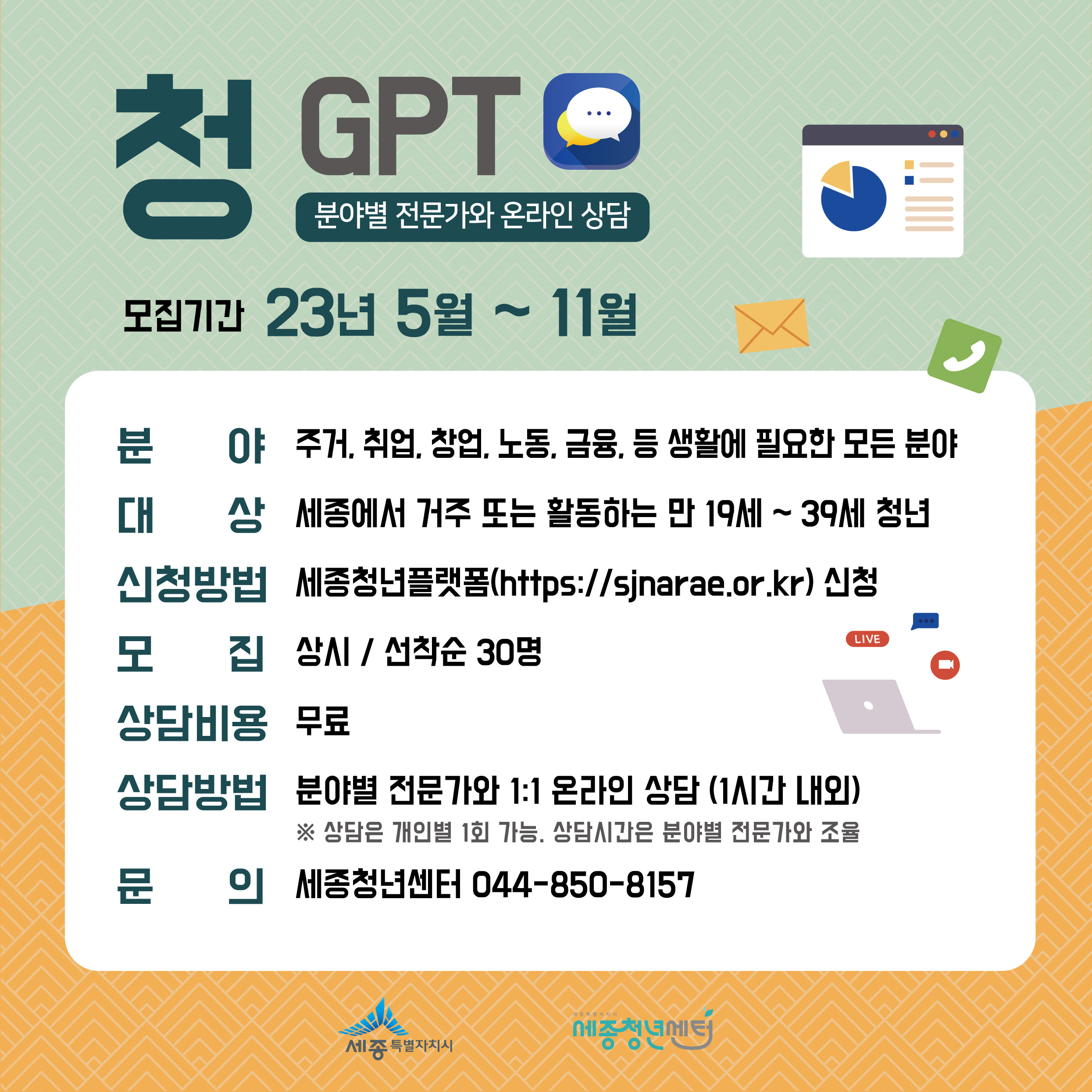 2023 청년정착상담소 생활상담 참여자 모집 모집기간 2023.06.12. - 2023.11.30. 모집마감 서비스 구분 기타 지원대상 청년 기관명 세종청년센터 기관 주소 세종시 다정중앙로 20 담당자 연락처 044-850-8157 담당자 이메일 sjnarae2030@naver.com 지원방법 온라인 신청 지원신청 이동하기 목록