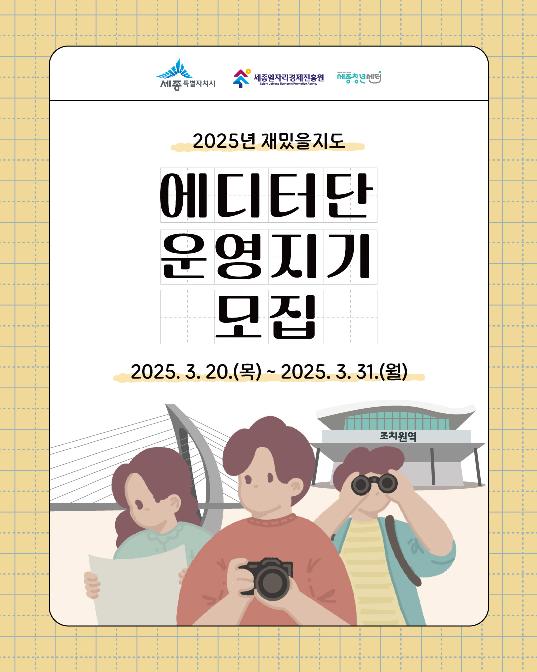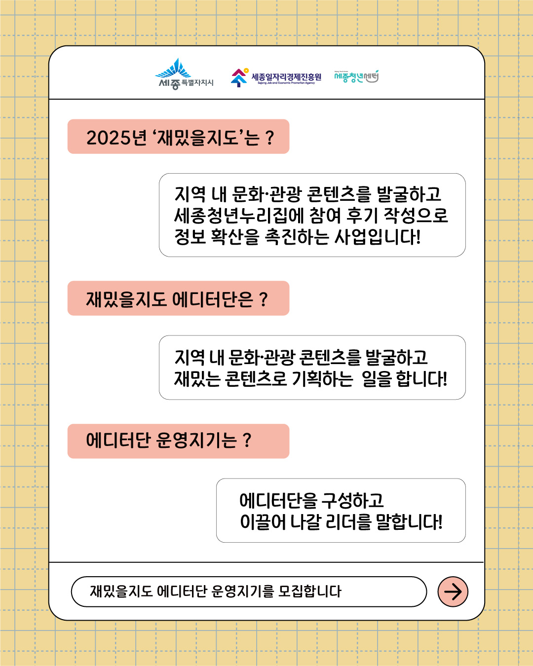 [2025년 재밌을지도] 에디터단 운영지기 모집 관리자 2025.03.24 조회수 297 ※ 이미지를 클릭하시면 신청 홈페이지로 이동합니다 ※ 첨부파일 2025년_문화생태계_리빙랩_재밌을지도_에디터단_운영지기_모집_공고.pdf 176.3 KB KakaoTalk_20250321_103603868.jpg 304.5 KB KakaoTalk_20250321_103603868_01.jpg 308.8 KB KakaoTalk_20250321_103603868_02.jpg 320.6 KB KakaoTalk_20250321_103603868_03.jpg 335.8 KB 전체 다운로드 목록