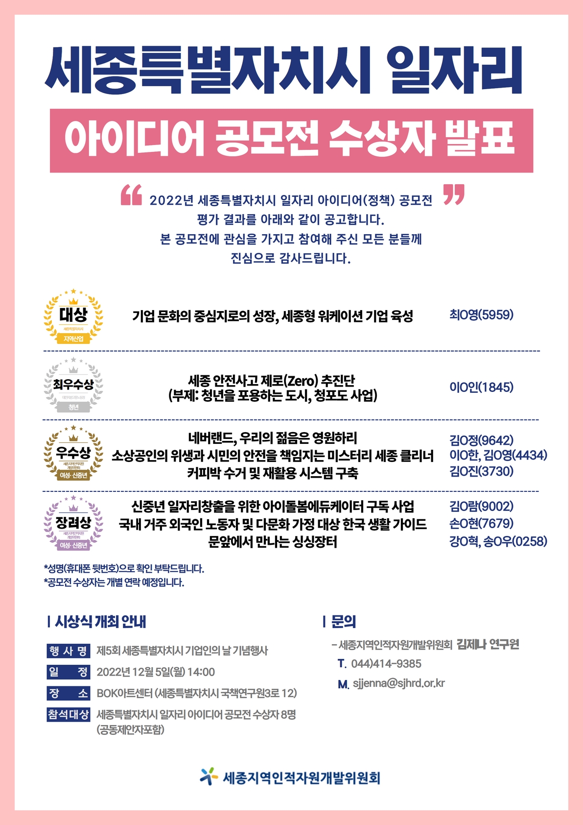 [세종특별자치시] 2022년 일자리 아이디어(정책) 공모전 수상자 발표