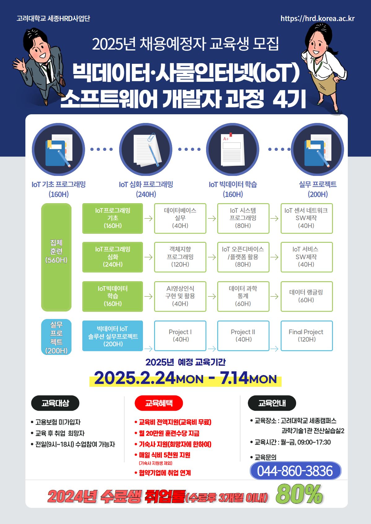 빅데이터⋅사물인터넷 SW 개발자 과정 모집 모집기간 2025.01.14. - 2025.02.23. 모집마감 서비스 구분 교육훈련 지원대상 기타 기관명 고려대학교 세종캠퍼스 기관 주소 고려대학교 세종캠퍼스 담당자 연락처 044-860-3836 담당자 이메일 지원방법 온라인 신청 지원신청 이동하기 목록