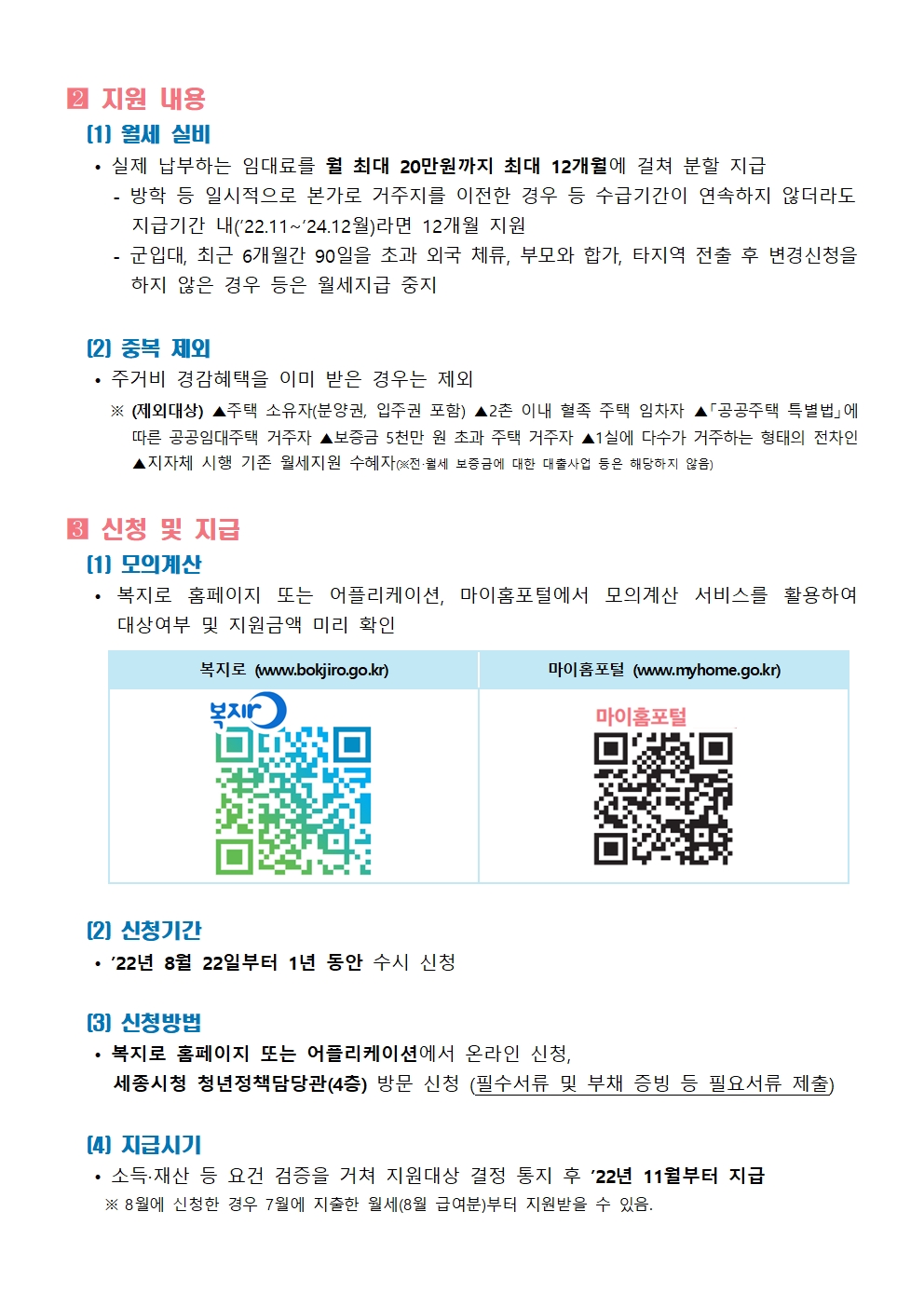 청년월세 한시 특별지원 사업 모집기간 2023.01.01. - 2023.08.21. 모집마감 서비스 구분 정착지원 지원대상 청년 기관명 국토교통부 기관 주소 세종특별자치시 한누리대로 2130 담당자 연락처 1600-0777 담당자 이메일 지원방법 온라인 및 오프라인 신청 지원신청 이동하기 목록