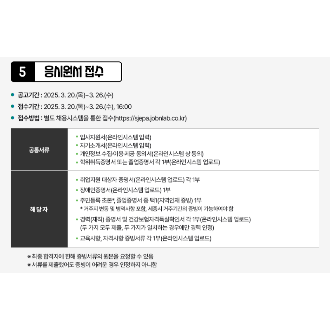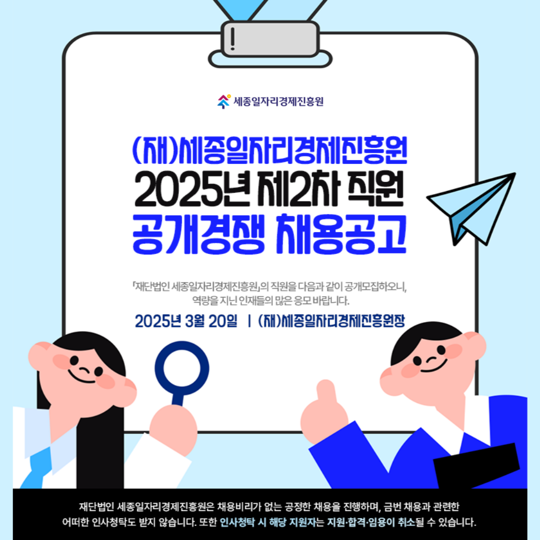 세종일자리경제진흥원 2025년 제2차 직원 공개경쟁 채용공고 관리자 2025.03.24 조회수 532 ※ 이미지를 클릭하시면 채용 신청 홈페이지로 이동합니다 ※ 첨부파일 001.png 303.4 KB 002.png 341.1 KB 003.png 281.1 KB 004.png 255.2 KB 005.png 433.7 KB 006.png 253.6 KB 007.png 207.4 KB 008.png 321.6 KB 009.png 527.4 KB 010.png 425.1 KB 전체 다운로드 목록