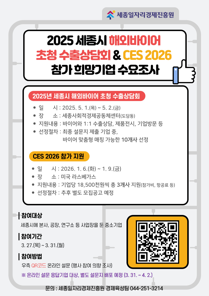 '2025년 세종시 해외바이어 초청 수출상담회'와 'CES 2026 참가 지원사업'의 희망 기업 수요조사를 실시합니다.