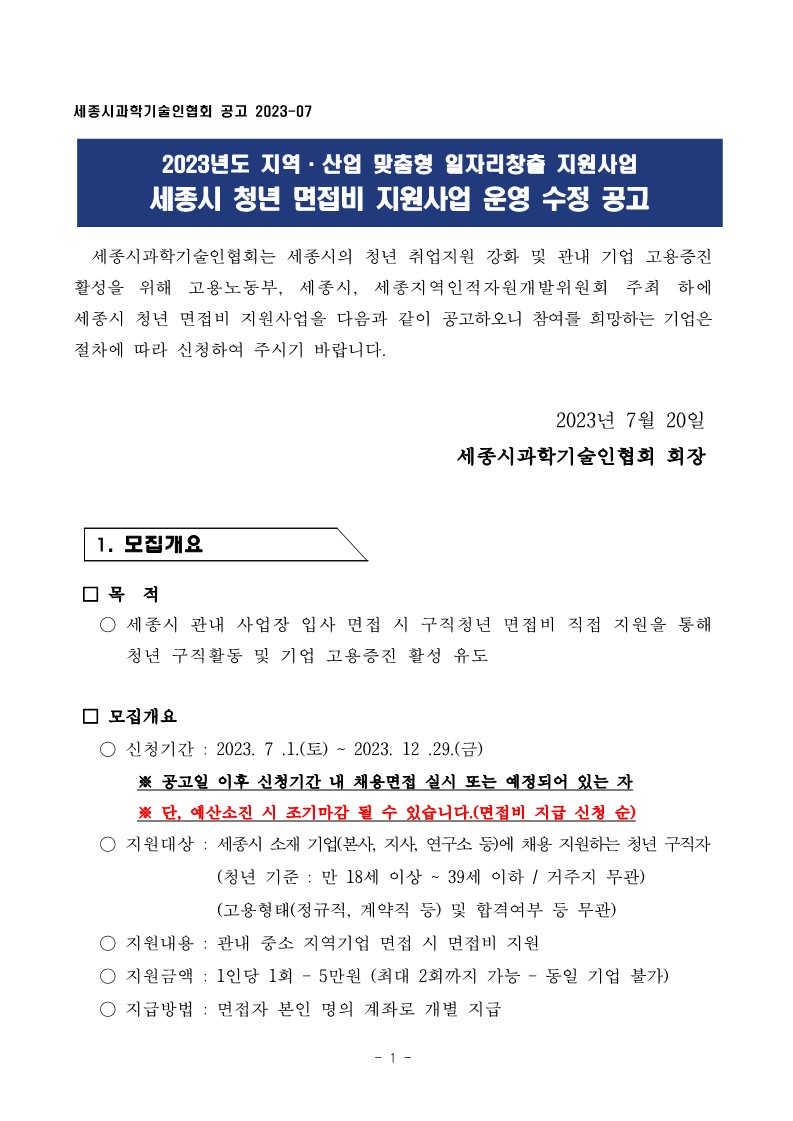 2023년도 세종시 청년 면접비 지원사업 운영 수정 공고
